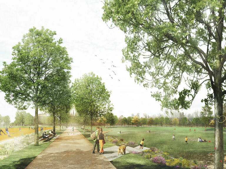 Der Bereich des Schießwasens bleibt zentrales Element für Großveranstaltungen in Ellwangen. Allerdings sind die Flächen neu geordnet, sodass eine viel grünere Gestaltung für Aufenthaltsqualität sorgt. Kalter Markt und Pferdetage können hier ab 2027 wieder gefeiert werden.